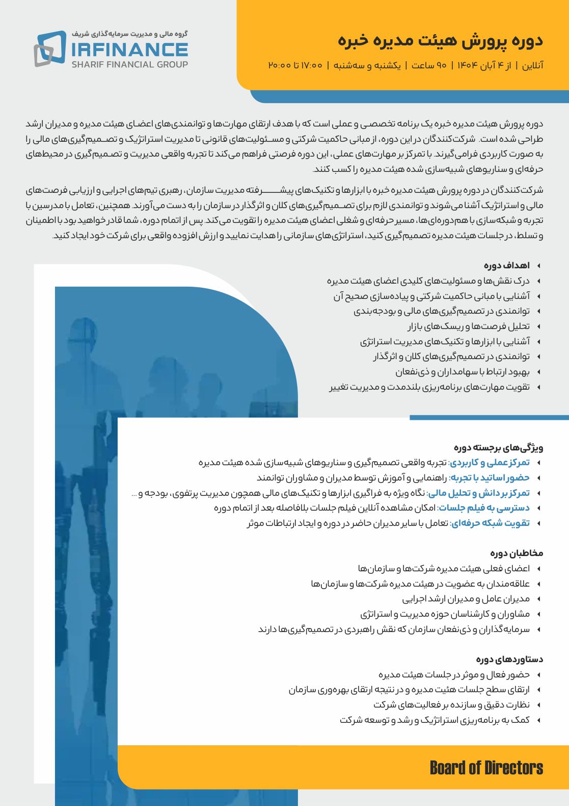 آشنایی با مسئولیتها و نقشهای کلیدی هیئت مدیره (۳ ساعت)
